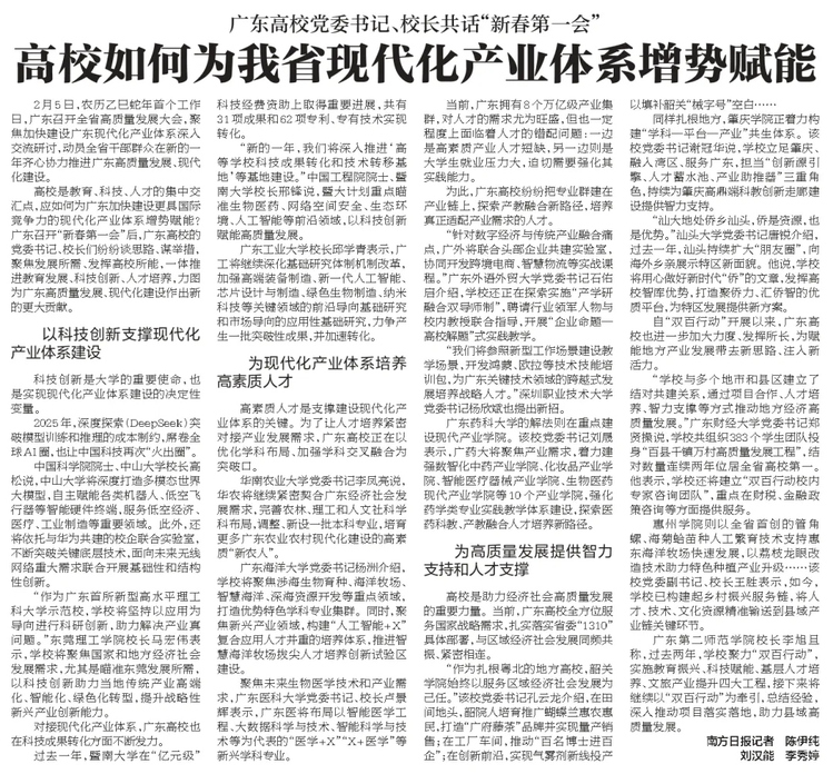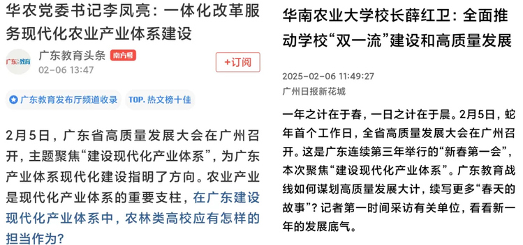 岭南春来早,人勤地生宝。随着广东省高质量发展大会的召开,“建设现代化产业体系”成为近期刷屏高频词,南方日报、南方+、广州新闻联播、广州日报、南方网、羊城晚报、新快报等媒体专访华农党委书记李凤亮、校长薛红卫畅谈产业发展,共话华农作为。