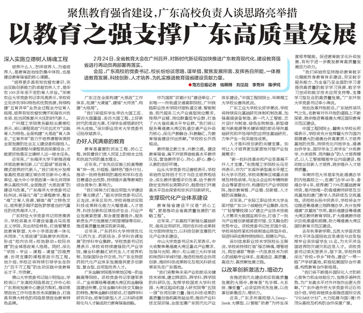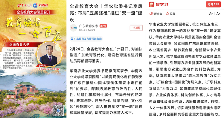 2月24日,全省教育大会在广州召开,对新时代新征程加快推进广东教育现代化建设教育强省进行再动员再部署再落实。华农师生第一时间学习大会内容,纷纷表示将立足学校“双一流”建设实际,为扎实推进教育强省建设贡献力量。
