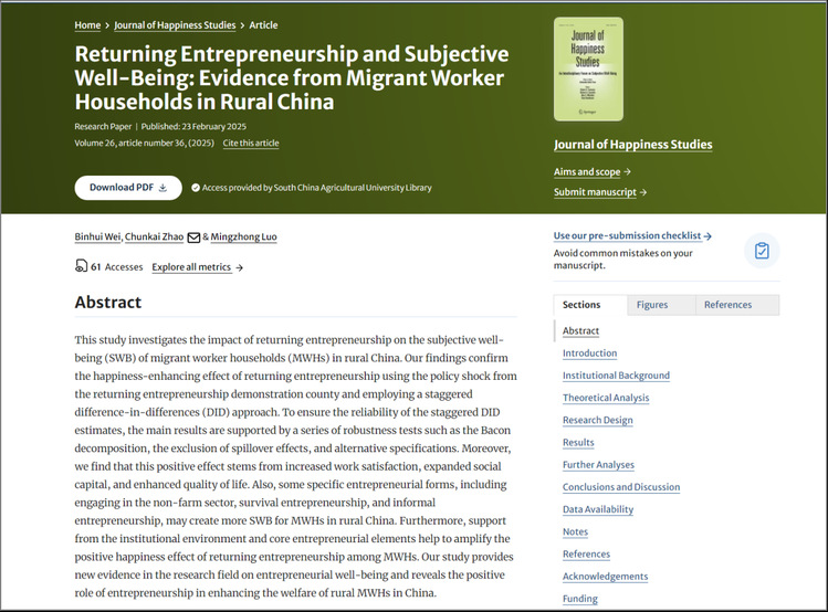 此外,Returning entrepreneurship and subjective well-being: Evidence from migrant worker households in rural China一文发表在幸福经济学领域权威期刊Journal of Happiness Studies(中科院2区,JCR Q1)。