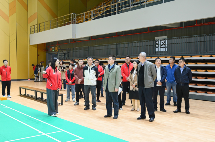 调研组一行通过场馆沙盘模型详细了解整体布局规划,并实地勘查比赛场馆、训练场地、功能用房及配套设施。