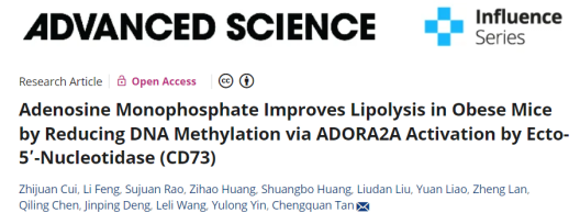 近期,我校动物科学学院谭成全副教授联合中科院亚热带研究所畜牧健康养殖中心印遇龙院士在知名期刊Advanced science(影响因子16.3,中科院1区TOP期刊)发表了题为“Adenosine Monophosphate Improves Lipolysis in Obese Mice by Reducing DNA Methylation via ADORA2A Activation by Ecto-5’-Nucleotidase (CD73)”的研究论文。