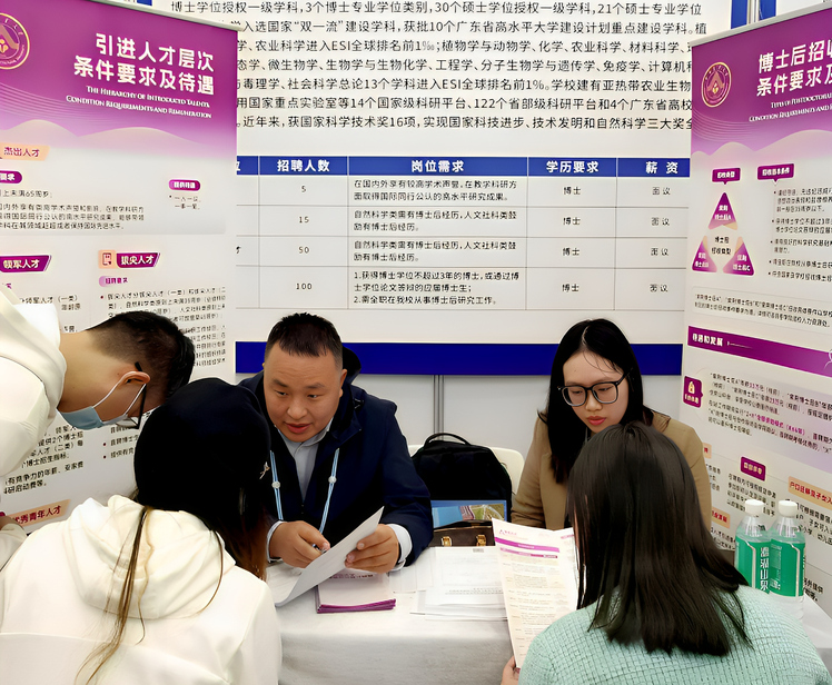 作为华南地区唯一的农林类“双一流”建设高校,华农全面响应省“百万英才汇南粤”行动计划部署,持续释放广纳英才“强信心”和求才若渴“强信号”,优化人才引育工作机制,深入实施“高层次人才精准引进计划”,聚焦作物学、畜牧兽医学、农业工程、人工智能等领域推出人才引进和博士后等近200个优质教学科研岗位。现场,我校招聘展位人头攒动、热闹非凡,工作人员与前来投递简历的优秀博士、博士后“一对一”交流,为人才介绍学校引才政策及待遇支持条件,耐心解答人才关切,以满满诚意传递学校延揽英才的决心。据统计,当日共收到来自帝国理工大学、新加坡国立大学、香港大学、清华大学、北京大学等顶尖高校的应聘者简历100余份。