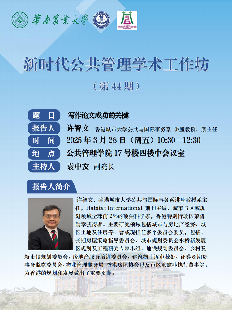 公共管理学院20周年院庆“学术公管”系列活动之001:新时代公共管理学术工作坊(第44期):写作论文成功的关键
