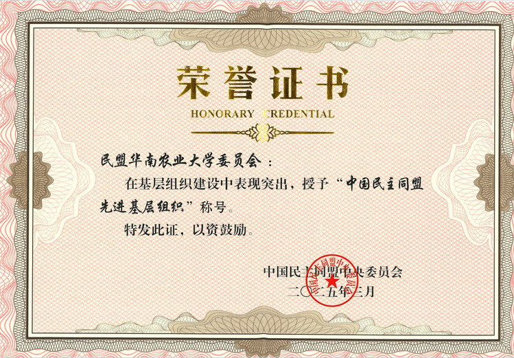 为表彰先进、树立典型,民盟中央决定,对2024年以来在组织工作方面表现突出的集体进行表彰。其中,民盟华南农业大学委员会被授予“中国民主同盟先进基层组织”称号。