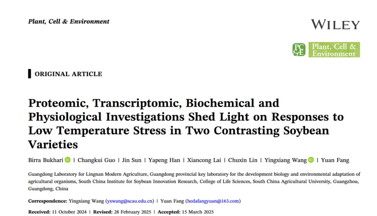近日,华南农业大学、岭南现代农业科学与技术广东省实验室植物生殖发育和大豆种质创新研究团队王应祥教授课题组在Plant, Cell & Environment(中科院一区Top期刊)上在线发表了题为“Proteomic, Transcriptomic, Biochemical and Physiological Investigations Shed Light on Responses to Low Temperature Stress in Two Contrasting Soybean Varieties”的文章,揭示了两个我国南北方代表性大豆品种华夏3号和黑河43号在低温胁迫下的差异性应答机制。相关研究为大豆耐寒品种的选育提供了理论依据和分子资源。