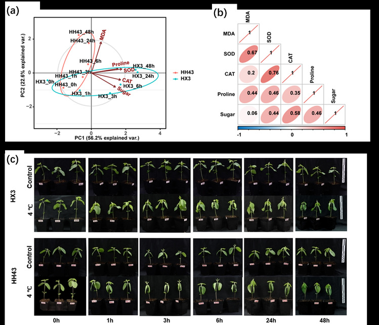 研究团队通过植物形态、生理生化指标以及转录组与蛋白质组多组学综合分析,揭示了两个大豆品种在低温胁迫下的差异性应答机制。研究对象为我国南北两个代表性大豆品种:来自东北地区的黑河43(HH43)和来自华南地区的华夏3号(HX3)。虽然传统认知上北方品种应更耐寒,但实验却发现,华夏3号在4℃低温处理下的表现更为出色,不仅叶片萎蔫延迟,且抗氧化能力更强,显示出显著的抗寒优势。