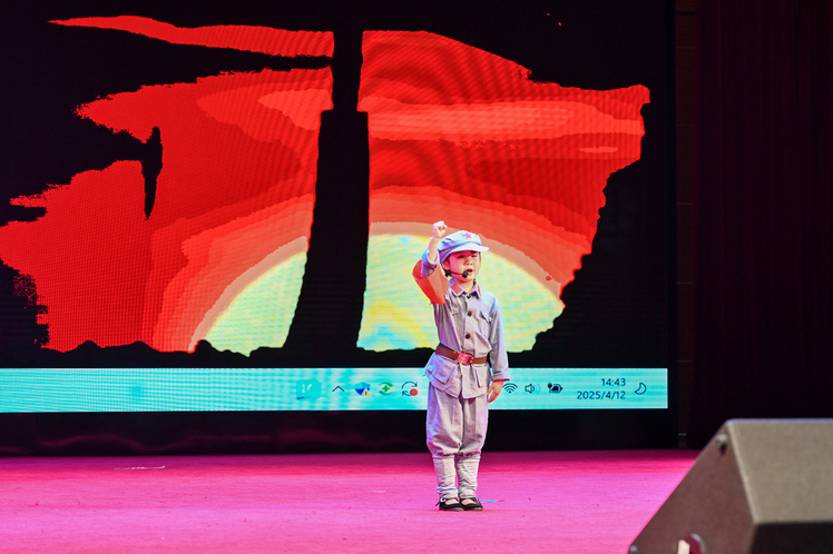 文艺汇演分为“烽火岁月·英雄魂”“薪火相传·护国安”“盛世华章·展新篇”三大篇章,亮点频现:幼儿园孩子们稚嫩的朗诵《一颗没有射出的子弹》拉开活动序幕;附属小学学生铿锵诵读《弱国无外交》再现历史警示;大学生教官团刺杀操表演刚劲有力,彰显新时代青年的血性担当;舞蹈《吾国万疆》以磅礴舞姿抒发对山河的热爱;军歌联唱《强军战歌》激昂澎湃,将现场气氛推向高潮。从童声启蒙到青春誓言,红色基因在跨越学段的接力中生生不息。