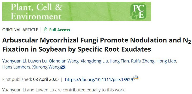 近日,资源环境学院根系生物学研究中心、亚热带农业生物资源保护与利用国家重点实验室王秀荣课题组在Plant, Cell & Environment发表了题为“Arbuscular mycorrhizal fungi promote nodulation and N2 fixation in soybean by specific root exudates”的研究论文,发现AM真菌通过诱导根系分泌特定的类黄酮和酚酸化合物促进大豆结瘤固氮。