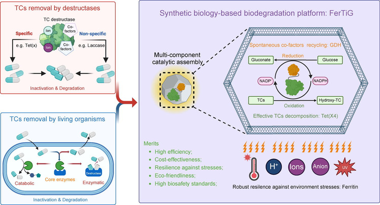 抗生素的大量使用引起的药物残留是细菌耐药性进化的重要推手,已经严重威胁动物源食品安全与公共卫生安全。为降低抗生素残留对病原菌造成的选择压力,延缓细菌耐药性的发展,孙坚教授团队前期提出了“以子之矛攻子之盾”理念,通过酵母平台构建Tet(X4)降解酶的“生物工厂”,大量生产降解四环素残留的功能酶以实现环境改良(Sci Total Environ 2022, IF:9.8)。在此基础上,利用Tet(X4)黄素单加氧酶的特性,通过搭载铜基类芬顿催化物的方式增强了Tet(X4)在环境原位中的降解效率(Chem. Eng. J. 2023 IF: 15.1)。进一步通过利用酵母全细胞裂解物中的生物基质,为Tet(X4)原位抗生素降解中提供必需的辅因子与结构保护,大幅度降低其使用成本并增加了稳定性(Environ. Int. 2023, IF: 11.3)。并通过构建工程益生活酵母EMYA-01,实现了抗生素残留的体内降解(J. Clean. Prod.,IF:9.8)。为进一步平衡抗生素残留降解中的成本、效率以及生物安全性,孙坚教授团队基于合成生物学手段构建了一种模拟微生物中微区室结构(microcompartment)多酶复合体(multi-enzyme complex)FerTiG(ferritin-caged Tet(X4) with co-factor recycling property that powered by GDH)。FerTiG整合了微生物中多种功能蛋白相互辅助,实现对四环素残留高效稳定安全的降解。其中,Tet(X4)作为降解模块负责四环素残留的分解,在此基础上,循环模块GDH能够通过催化葡萄糖氧化为Tet(X4)提供NADPH作为反应的辅基,维持四环素分解反应持续进行,共同翻译的保护模块 Ferritin能够在上述两种功能酶外部形成一层致密区室,抵抗外界逆境因素的干扰,始终维持分解反应的高效进行。结果表明FerTiG能够在廉价底物葡萄糖的驱动下快速分解水体中的四环素残留,在降低10倍成本的基础上提升反应效率约7倍。不但如此,FerTiG相较于单独降解酶的应用能够在多种逆境条件下(低pH、高温、高渗、紫外辐照等)维持反应的高效进行。并且相较于使用活菌,FerTiG展现了优越的安全性能,在降解抗生素残留的同时最大限度降低了生物安全与生态安全风险。本研究不但提供了FerTiG作为消除抗生素残留中的有效策略,还揭示了利用合成生物学构建“仿微区室结构模块化功能酶复合体”通过级联催化在清除其他环境污染物中的功能范式。
