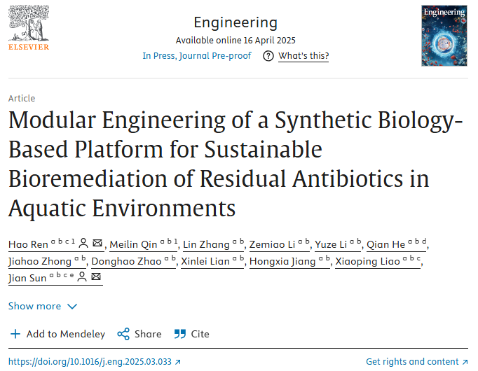 近日,兽医学院动物疫病预防控制全国重点实验室、国家兽医微生物耐药性风险评估实验室、广东省兽药研制与安全评价重点实验室孙坚教授团队在中国工程院院刊Engineering (影响因子10.1)在线发表了题为“Modular Engineering of a Synthetic Biology-Based Platform for Sustainable Bioremediation of Residual Antibiotics in Aquatic Environments”的研究文章。