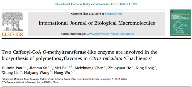 近日,华南农业大学药用植物研究中心吴鸿教授团队在International Journal of Biological Macromolecules(中科院二区Top期刊,影响因子7.7)在线发表题为“Two Caffeoyl-CoA O-methyltransferase-like enzyme are involved in the biosynthesis of polymethoxyflavones in Citrus reticulata ‘Chachiensis’”的研究论文。该研究首次揭示了茶枝柑中CrcCCoAOMT7-1和CrcCCoAOMT7-2两种甲基转移酶在重要生物活性成分多甲氧基黄酮(PMFs)生物合成中的关键作用,并解析了其作用机制,为药用植物PMFs的生物合成机制提供了新见解,为合成生物学定向生产天然抗癌成分PMFs提供了新资料。