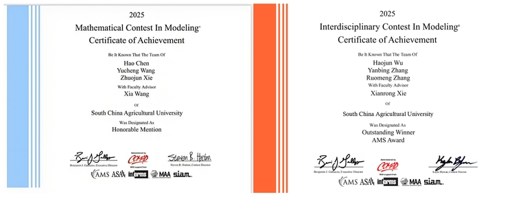 近日,2025年美国(国际)大学生数学建模竞赛和交叉学科建模竞赛(MCM/ICM)成绩公布。据统计,本届赛事我校共有24支队伍参赛,获得美国数学学会特别奖(AMS Award)1项、Outstanding Winner奖(特等奖)1项、Meritorious Winner奖(第三等级奖)1项、Honorable Mention奖(第四等级奖)5项和Successful Participant奖(成功参与奖)14项。