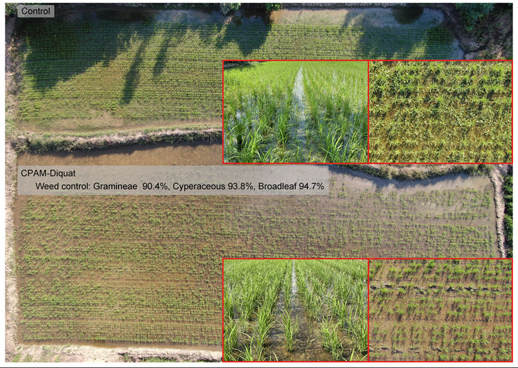 图4 超分子土壤封闭剂CPAM-敌草快在直播稻田的大田应用效果