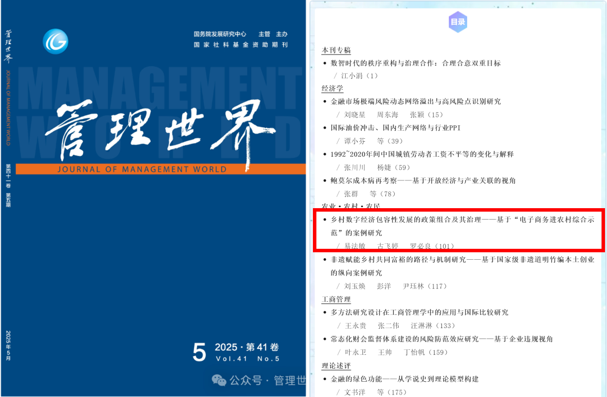 以经济管理学院易法敏教授为第一作者,博士生古飞婷为第二作者、罗必良教授为通讯作者的论文《乡村数字经济包容性发展的政策组合及其治理——基于“电子商务进农村综合示范”的案例研究》,发表于中文管理学顶刊《管理世界》2025年第5期。该文也是广东省普通高校人文社科重点研究基地—“广东省乡村数字经济发展研究院”成立以来的一项重要成果。