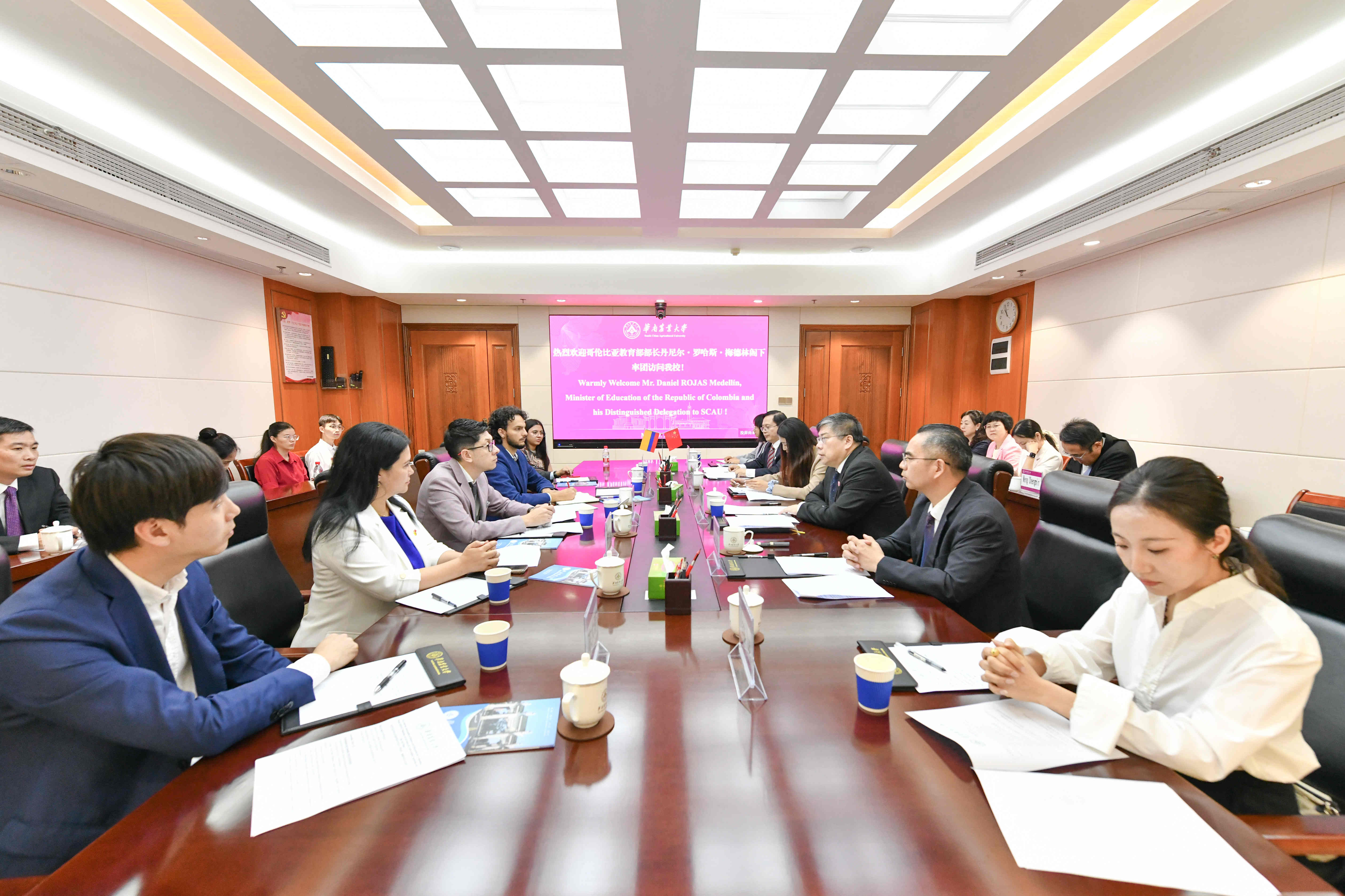 薛红卫与罗哈斯共同签署了华南农业大学-哥伦比亚海外教育与技术信贷中心合作备忘录。副校长陈乐天介绍了中拉联盟的建设及中哥合作进展,广东省教育厅交流合作处相关负责人介绍了广东省教育情况及对拉合作进展。与会人员围绕深化中哥教育、科技合作,共建中拉学院等内容进行深入交流。