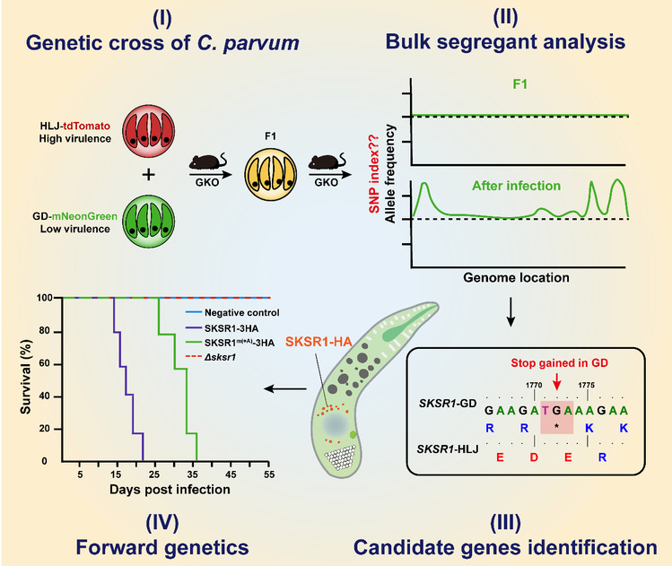 隐孢子虫作为仅次于轮状病毒的全球第二大腹泻病原体,可引发严重腹泻甚至死亡。针对我国畜牧业因良种引进和集约化养殖引发的犊牛隐孢子虫病频繁暴发、威胁人群健康这一新挑战,本研究聚焦病原体毒力决定因素和作用机制这一科学难题,通过不同毒力分离株的遗传杂交和杂交后代在感染过程中基因组动态变化分析,创新构建了隐孢子虫基因型-表型关联分析体系,首次鉴定出三个与病原感染性和致病力显著相关的数量性状位点(QTL)。比较基因组学分析发现,在QTL区域的23个候选基因中,低毒力虫株在两个关键毒力基因存在功能缺失突变,其中编码分泌蛋白SKSR1的基因序列类型与杂交后代及野生分离株的致病力显著相关。进一步采用反向遗传操作手段及体内外多维度感染模型,从分子层面揭示隐孢子虫的核心毒力因子为SKSR1。该研究成果不仅为隐孢子虫毒力进化机制研究提供新范式,更为抗寄生虫新药研发和疫病精准防控提供了关键分子靶点和理论依据。
