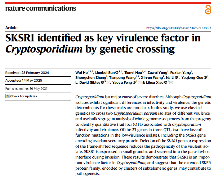 近日,我校兽医学院肖立华和冯耀宇教授团队在病原生物学领域取得重大突破,并在国际知名期刊Nature Communications在线发表题为“SKSR1 identified as key virulence factor in Cryptosporidium by genetic crossing”的研究论文。该研究首次采用正向和反向遗传学手段揭示人兽共患微小隐孢子虫(Cryptosporidium parvum)毒力的遗传决定因素,为隐孢子虫病的防控提供了重要理论依据。