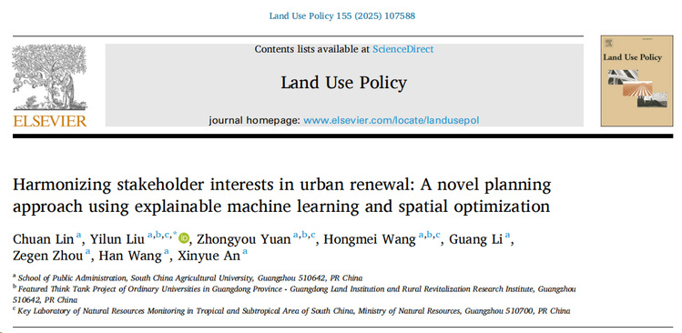 近日,公共管理学院刘轶伦课题组在城市更新领域取得重要突破,其研究成果,并在中科院一区Top期刊Land Use Policy(影响因子6.0)发表题为“Harmonizing Stakeholder Interests in Urban Renewal: A Novel Planning Approach Using Explainable Machine Learning and Spatial Optimization”的论文。