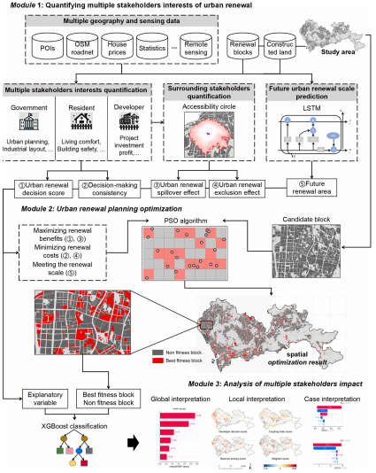 针对当前城市更新规划中多方利益博弈难协调、选址决策可解释性不足等问题,团队创新性地构建了多利益相关者视角的城市更新规划优化模型(MSP-URPO)。该模型通过融合可解释机器学习(XML)与多目标优化算法,实现了对政府、居民、开发商等多元主体决策影响力的量化分析,有效破解了传统方法中目标冲突与决策“黑箱”两大难题。