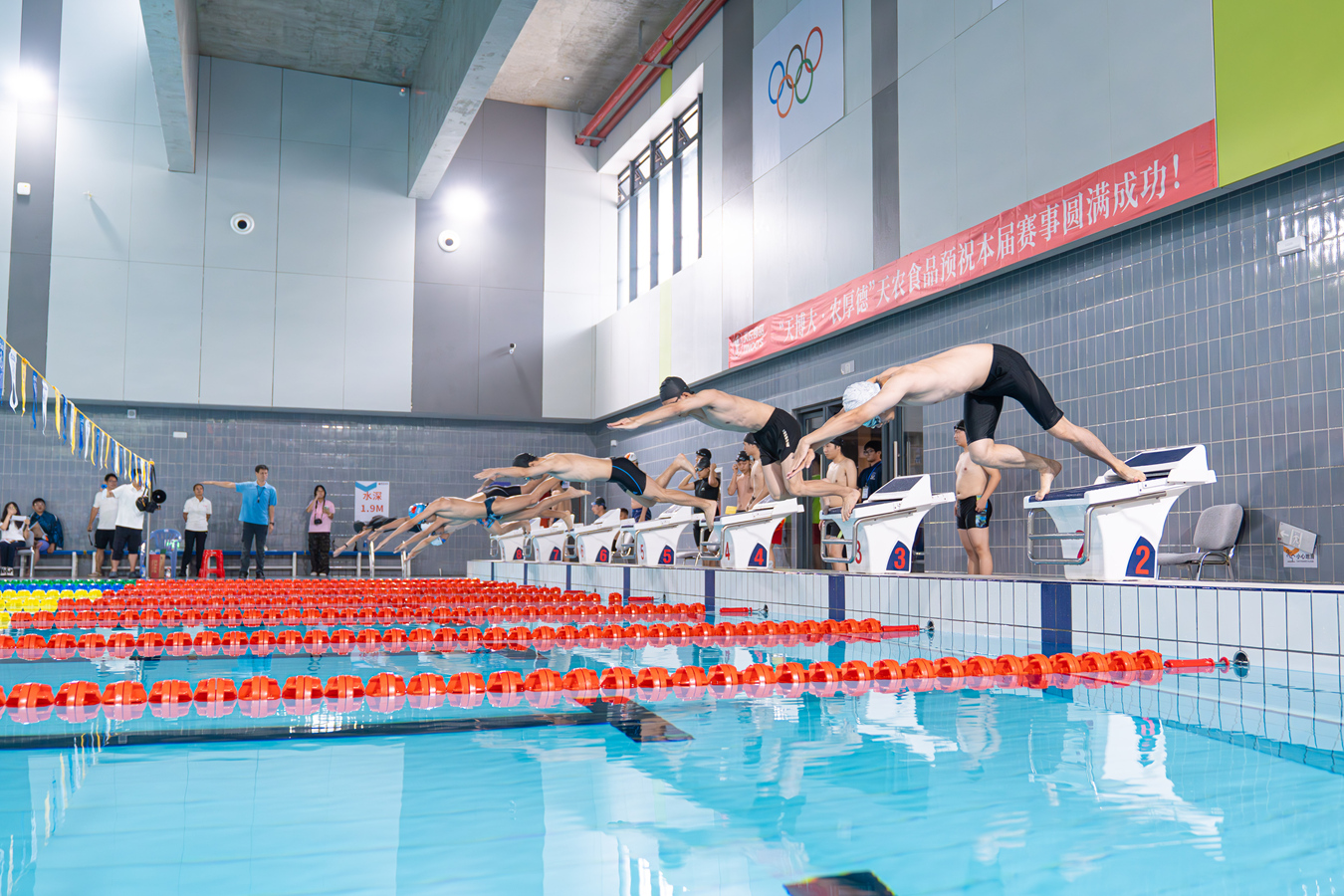 5月30日,华南农业大学第59届游泳运动会(以下简称“水运会”)首次在学校综合体育馆游泳馆内精彩开赛,近500名师生参赛。比赛为期一天,设置了自由泳、蛙泳、蝶泳、仰泳、混合泳接力、男女子混合自由泳接力等31个竞赛项目。今年还增加了教职工游泳项目,共有250多位老师参赛,其中师生混合泳项目,老师同学们同场竞技、携手接力。