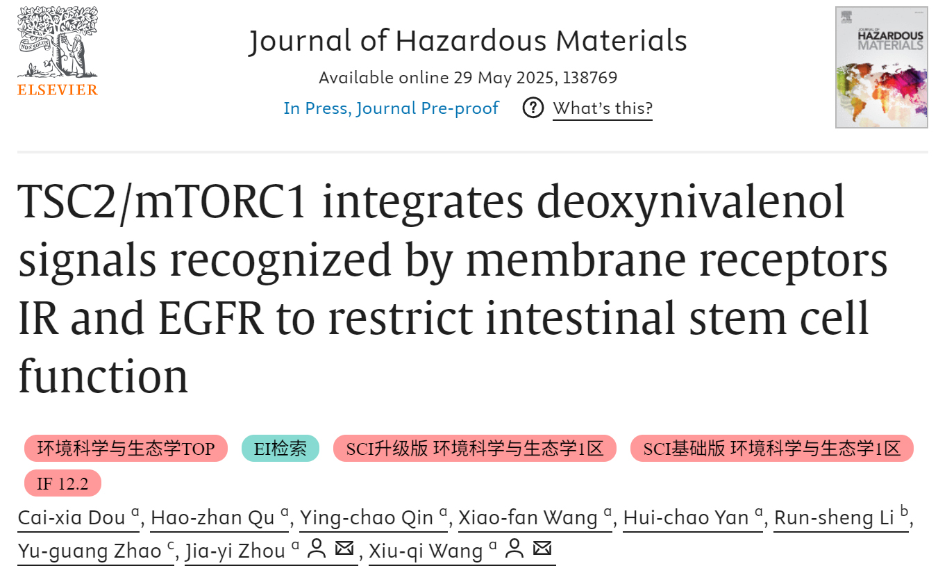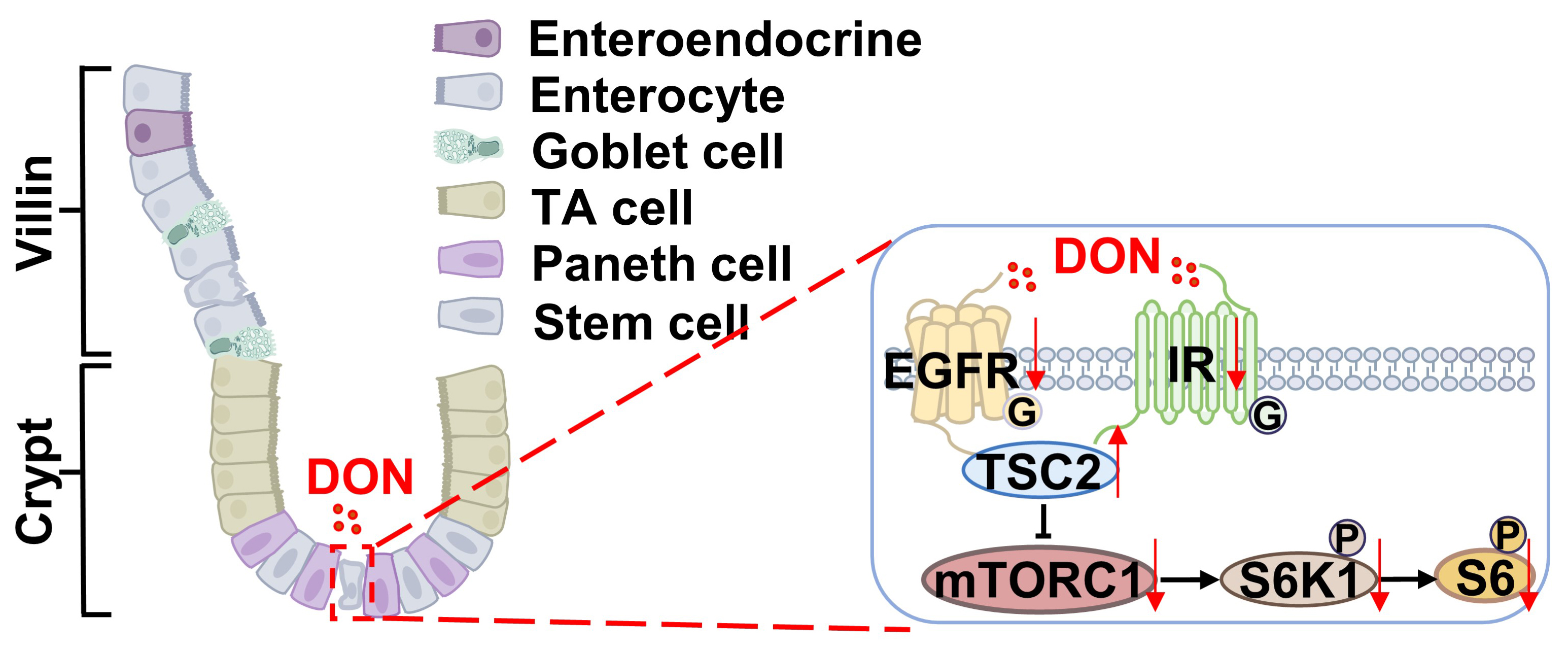 近日,我校动物科学学院、猪禽种业全国重点实验室、国家生猪种业工程技术研究中心王修启研究员团队在国际经典学术期刊Journal of Hazardous Materials(影响因子:12.2,中科院一区,Top期刊)上发表题为“TSC2/mTORC1 integrates deoxynivalenol signals recognized by membrane receptors IR and EGFR to restrict intestinal stem cell function”的论文,揭示胞外呕吐毒素(Deoxynivalenol,DON)结合胰岛素受体(Insulin receptor,IR)/表皮生长因子受体(Epidermal growth factor receptor,EGFR),抑制雷帕霉素靶蛋白质(Mechanistic target of rapamycin complex 1,mTORC1)信号,降低干细胞活性,损伤仔猪肠道新机制。