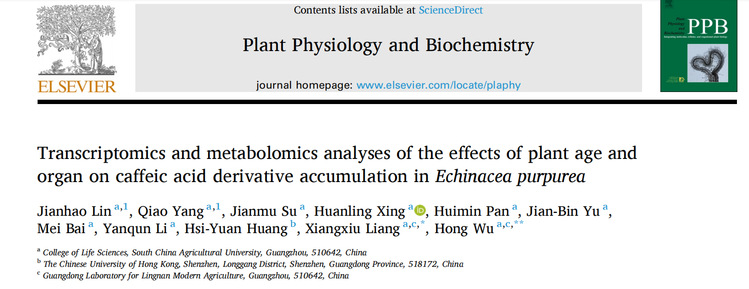 近日,华南农业大学生命科学学院药用植物研究中心在Plant Physiology and Biochemistry杂志发表了题为“Transcriptomics and metabolomics analyses of the effects of plant age and organ on caffeic acid derivative accumulation in Echinacea purpurea”的研究文章。