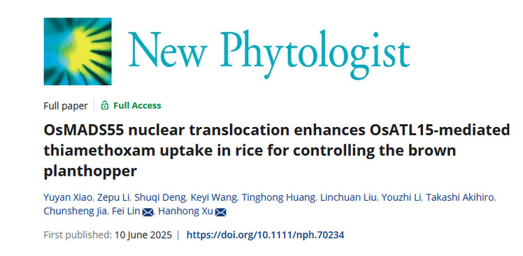 论文一:“OsMADS55 nuclear translocation enhances OsATL15 mediated thiamethoxam uptake in rice for controlling the brown planthopper”(New Phytologist)