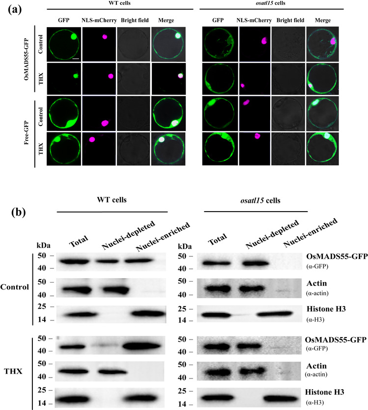 图1 噻虫嗪处理以OsATL15依赖方式促进OsMADS55从质膜转移到细胞核