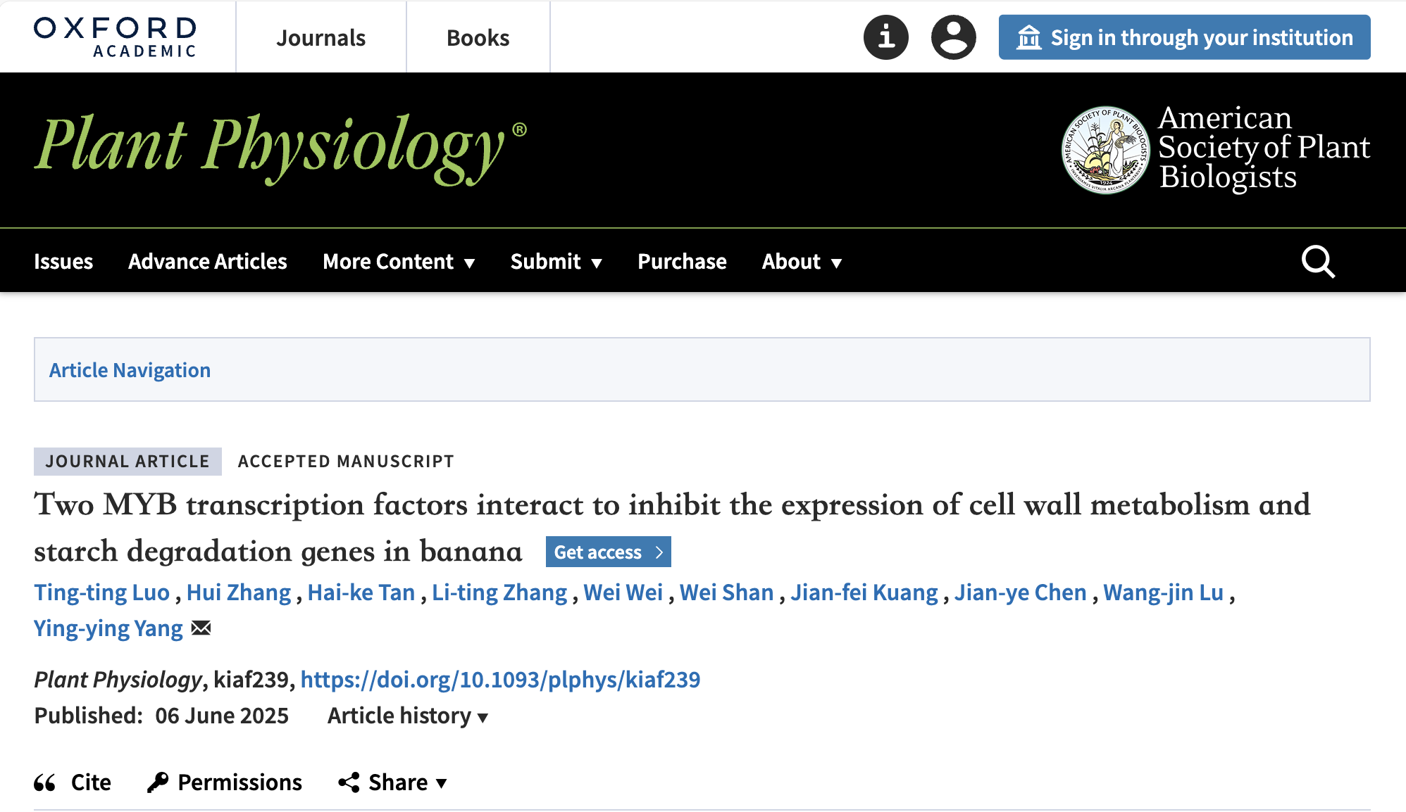 近日,园艺学院陆旺金教授团队在国际知名期刊Plant Physiology(植物学Top期刊)上发表题为“Two MYB transcription factors interact to inhibit the expression of cell wall metabolism and starch degradation genes in banana”的研究论文。该研究揭示了MaMYB44-MaMYB73转录抑制模块协同调控香蕉果实软化的分子机制,为延缓果实软化、提升采后品质提供了理论依据。