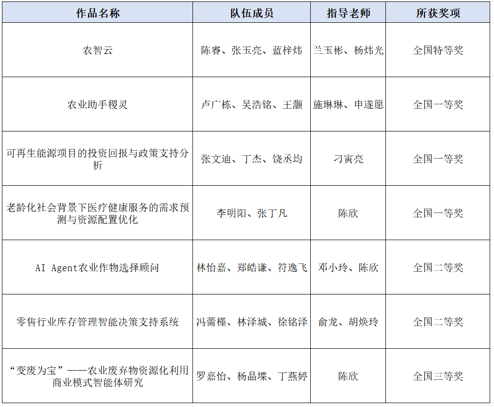 李明阳、张丁凡团队(指导教师:陈欣)开发的老年医疗智能预测系统、张文迪、丁杰和饶丞均团队(指导教师:刁寅亮)设计的可再生能源智能体模型,以及卢广栋、吴浩铭和王灏团队(指导教师:施琳琳、申遂愿)研发的“稷灵”农业助手,分别获得了全国一等奖。各项目不仅契合大赛主旨,也展现了我校在人工智能与多学科交叉领域的深厚积累和创新能力。