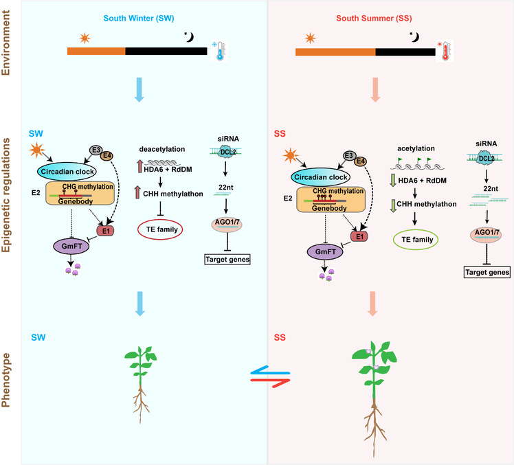 在南方冬季与夏季,大豆面临显著的环境差异:冬季日照较短、气温较低,而夏季则日照延长、温度升高。这些环境变化深刻影响大豆的生长节律与发育进程。植物生物钟通过昼夜节律调控关键发育基因的表达,从而介导表观遗传调控路径的动态变化。作为大豆驯化过程中重要的开花抑制因子,E2基因在冬、夏季节中呈现出不同的响应模式。其基因体区域的DNA甲基化状态变化,进一步影响了下游开花调控因子GmFT的表达水平。此外,在冬季HDA6蛋白与RNA依赖的DNA甲基化通路(RdDM)被激活,导致CHH甲基化水平显著升高,有效抑制多种活跃转座子。同时,冬季22-nt siRNA丰度降低,削弱了对环境响应相关基因的沉默调节。这些表观调控机制协同作用,促使大豆在冬季表现出植株矮小、开花延迟等典型适应性表型,反映出对寒冷与短日照环境的“抑制性响应”;而在夏季,CHH甲基化水平较低,转座子活性增强,同时22-nt siRNA丰度较高,植物表现出株高增加、开花提前的“促生性反应”,体现出生长与生殖发育的加速。