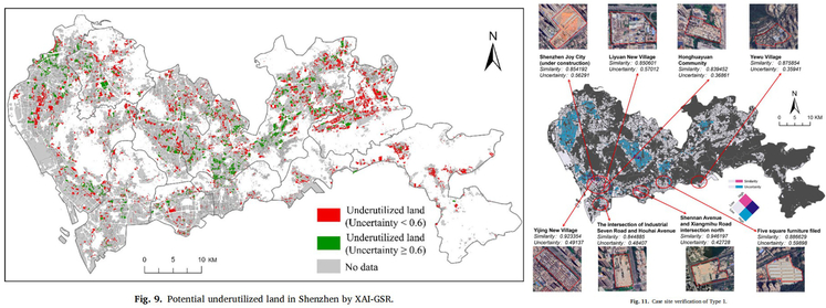 研究成果响应中央“推进城市更新”的政策方向,可为“集约高效利用土地”、“差异化更新治理”及“智慧城市决策”提供重要技术支撑。通过利用XAI-GSR模型低成本动态监测城镇低效用地空间分布,为城市更新规划提供更加可靠的技术支持工具。这不仅有助于减少行政部门进行低效用地外业调查的成本,还促进了理性城市更新和规划,推动了可持续城市发展。XAI-GSR模型推动城市更新决策支持系统朝着更加低成本、高效率、可解释的方向发展。