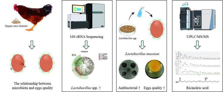 鸡蛋作为营养丰富的食品,其品质和货架期直接关系到消费者健康与食品安全。众所周知,蛋壳表面食源性病原微生物污染是影响鸡蛋品质和货架期的重要因素。最近研究发现,新生鸡蛋的表面同样富集经卵生代际遗传的大量益生菌。这些富集在蛋壳表面的益生菌参与了病原微生物在蛋壳表面的富集调控,从而维持了早期鸡蛋的品质。团队前期研究发现,有机微量元素饲喂增加了蛋鸡粪便及蛋壳表面乳杆菌的丰度,并利用生物信息学手段建立了乳杆菌表达丰度与鸡蛋品质之间的联系。随后,从这些鸡蛋的蛋壳表面分离了多株乳杆菌,并采用喷淋的方式将分离得到的乳杆菌培养上清液负载于蛋壳表面以观察其对蛋品质及蛋保鲜功能的影响。结果发现,黏膜乳杆菌在蛋壳表面的早期负载能够显著抑制蛋壳表面的病原微生物的繁殖,提高鸡蛋品质并延长鸡蛋的保鲜时间。为进一步揭示其调控蛋品质的机制,采用代谢组学技术对乳杆菌的代谢物进行了分析。结果表明,黏膜乳杆菌产生的关键代谢—蓖麻油酸是主要的贡献者,并且这种效果呈剂量依赖关系。综上所述,本研究揭示了黏膜乳杆菌在蛋壳表面早期负载对鸡蛋质量和货架期调控的潜在作用机制,为开发基于乳杆菌及其代谢物的鸡蛋保鲜技术提供理论支撑。