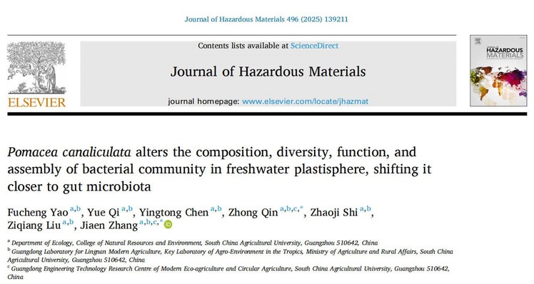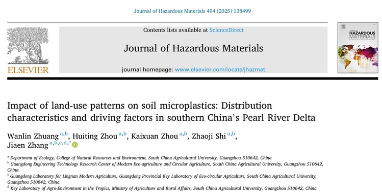 近日,我校资源环境学院、广东省现代生态农业与循环农业工程技术研究中心、农业农村部华南热带农业环境重点实验室、岭南现代农业科学与技术广东省实验室章家恩教授团队围绕珠江三角洲地区土壤微塑料的空间分布特征,以及微塑料在农田生态系统和水生生态系统的迁移转化、赋存、生态效应及其生态风险等领域开展研究,取得系列新进展。2025年5月以来,团队连续在环境科学与生态学领域著名期刊Journal of Hazardous Materials(中科院一区TOP,五年影响因子12.4)发表4篇学术论文。