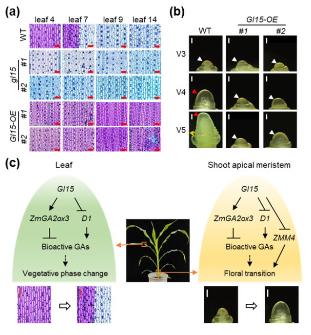 研究发现,Gl15是中美近现代玉米育种过程中调控早期营养生长时相转变的关键候选基因,且在育种过程中明显受到选择。Hap1是Gl15的早花优异单倍型,这一单倍型的选择频率在中美近现代玉米育种中逐渐增加。通过基因敲除及过表达材料的表型分析,研究表明,Gl15不仅抑制营养生长时相转变,还抑制成花转变,从而延迟了玉米的开花。进一步研究发现,Gl15能够在叶片和花序中,通过直接结合赤霉素(gibberellin, GA)合成基因(DWARF1[D1])和降解基因(ZmGA2ox3)的启动子,抑制D1的表达,同时激活ZmGA2ox3的转录活性,从而降低植株体内具有生物活性的GA含量,最终导致玉米开花延迟。此外,Gl15还能够直接转录抑制花器官发育基因ZMM4的表达来延迟玉米成花转变。该研究揭示了Gl15作为双重开花抑制子的作用,并阐明了Gl15通过降低体内GA含量和成花激活基因的表达来延迟开花,为培育适合不同生态区种植的玉米新品种提供了宝贵的基因资源和理论依据。