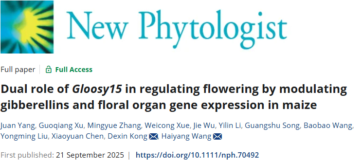 9月22日,生命科学学院、亚热带农业生物资源保护与利用国家重点实验室王海洋/孔德鑫团队联合崖州湾国家实验室在NewPhytologist上发表题为“Dual role of Gloosy15 in regulating flowering by modulating gibberellins and floral organ gene expression in maize”的研究论文。