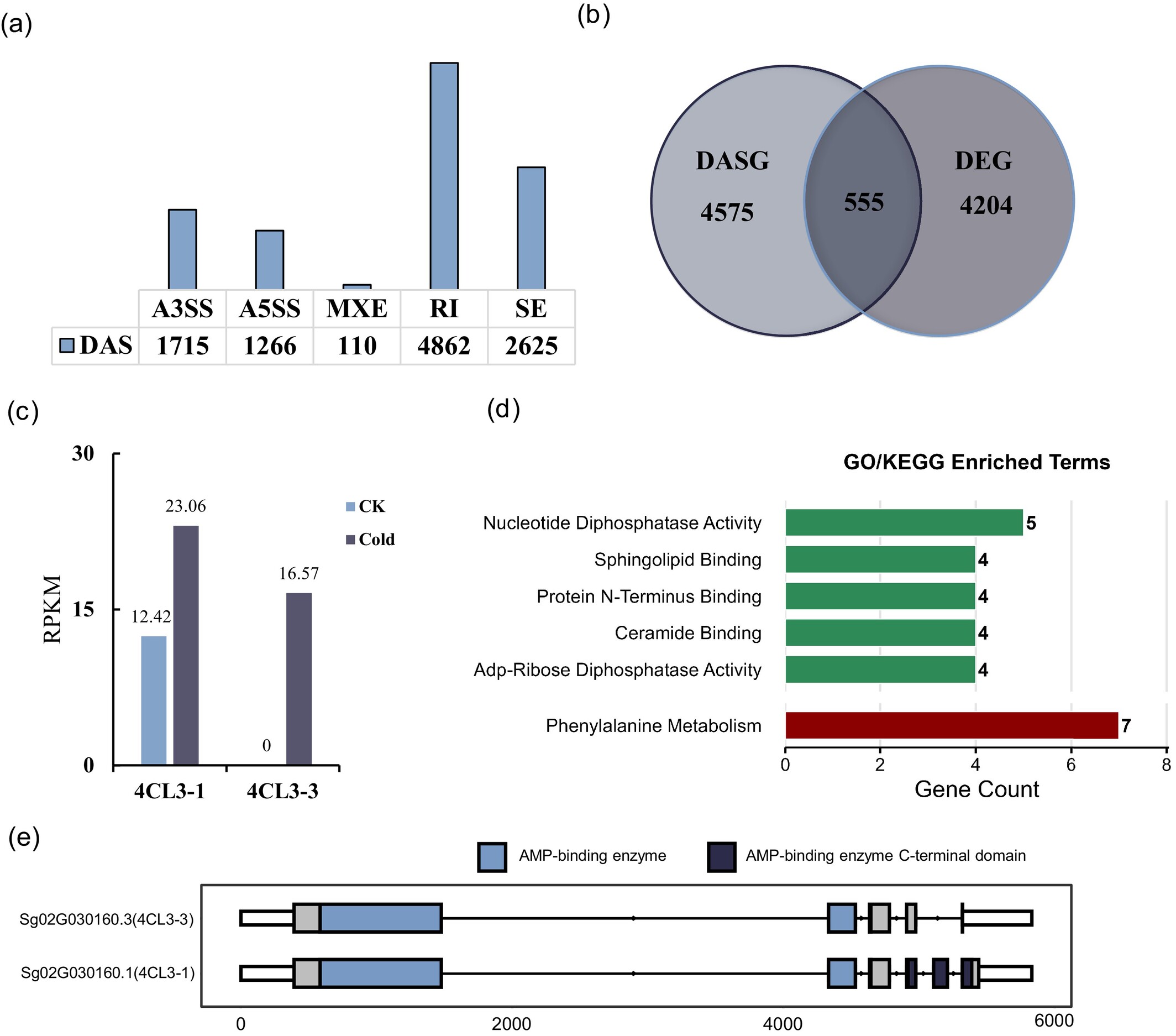 借助构建的转录本数据库,团队还发现了低温胁迫下的独特调控机制:低温可特异性诱导4-香豆酸辅酶A连接酶基因(Sg4CL3)上调表达,并触发外显子跳跃事件,导致AMP结合酶功能结构域缺失;同时低温显著增加Sg4CL3基因的甲基化位点密度。推测:低温通过诱导Sg4CL3基因的复杂甲基化模式,同时调控前体mRNA的可变剪接加工与转录本稳定性,形成“转录-可变剪接-表观修饰”多层次协同的低温响应机制,为解析植物表观遗传调控抗逆的分子逻辑提供了新线索。