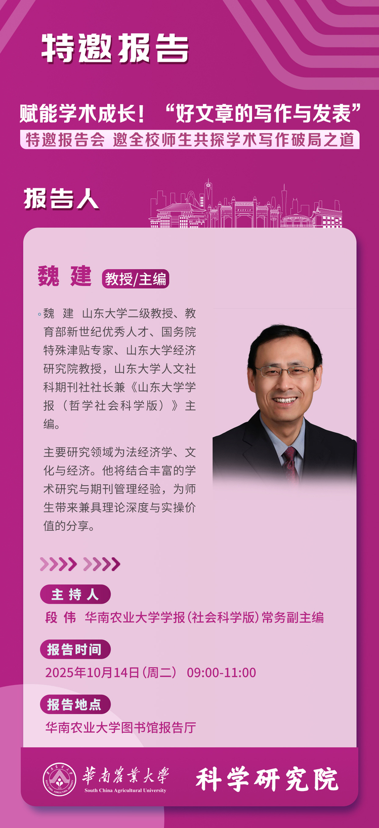 为提升我校师生学术写作能力,推动高水平科研成果的传播与发表,为师生系统解析从思想凝练到论文发表的系统方法论。科学研究院特邀请国内人文社科领域权威专家魏建教授,于2025年10月14日(周二)在图书馆报告厅举办“好文章的写作与发表”特邀报告会,为师生搭建高质量学术交流平台。现将具体事项通知如下:
