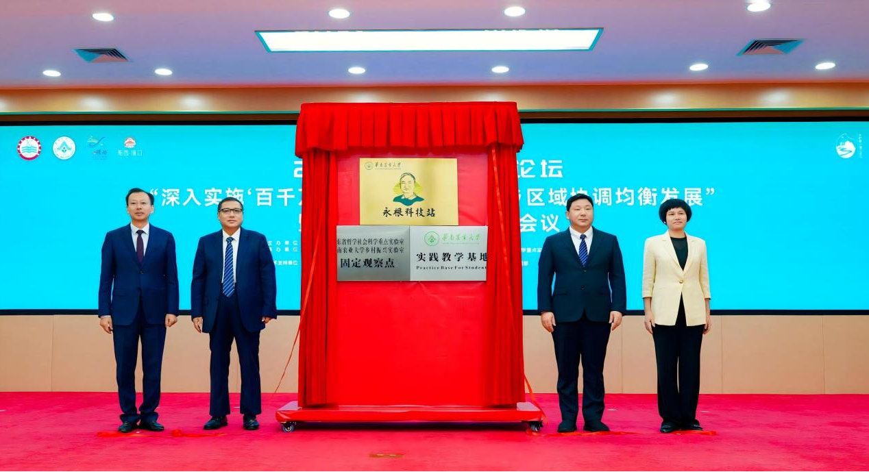 论坛举行了揭牌仪式,李宜航、李凤亮、王光飞、张秀洁共同为“华南农业大学永根科技站”“华南农业大学实践教学基地”“广东省哲学社会科学重点实验室—华南农业大学乡村振兴实验室固定观察点”揭牌。