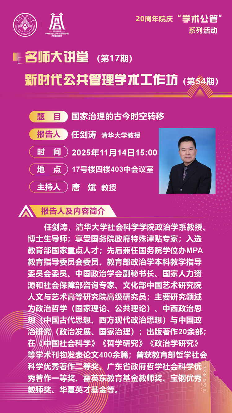 公共管理学院20周年院庆“学术公管”系列活动暨名师大讲堂(第17期)、新时代公共管理学术工作坊(第54期):国家治理的古今时空转移
