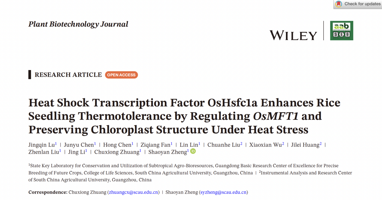 近日,生命科学学院、广东省高等学校未来作物精准育种基础研究卓越中心庄楚雄/郑少燕团队在中科院一区Top期刊Plant Biotechnology Journal上发表了题为 “The heat shock transcription factor OsHsfc1a enhances rice seedling thermotolerance by regulating OsMFT1 and preserving chloroplast structure under heat stress ”的论文。该研究成功鉴定了一个关键的热激转录因子OsHsfc1a,并深入解析了其通过抑制下游靶基因OsMFT1以维持叶绿体结构完整性、从而增强水稻幼苗耐热性的全新分子通路。这一发现不仅深化了我们对植物应对高温胁迫的理解,更为培育高产、稳产、耐热的水稻新品种提供了宝贵的基因资源和理论依据。