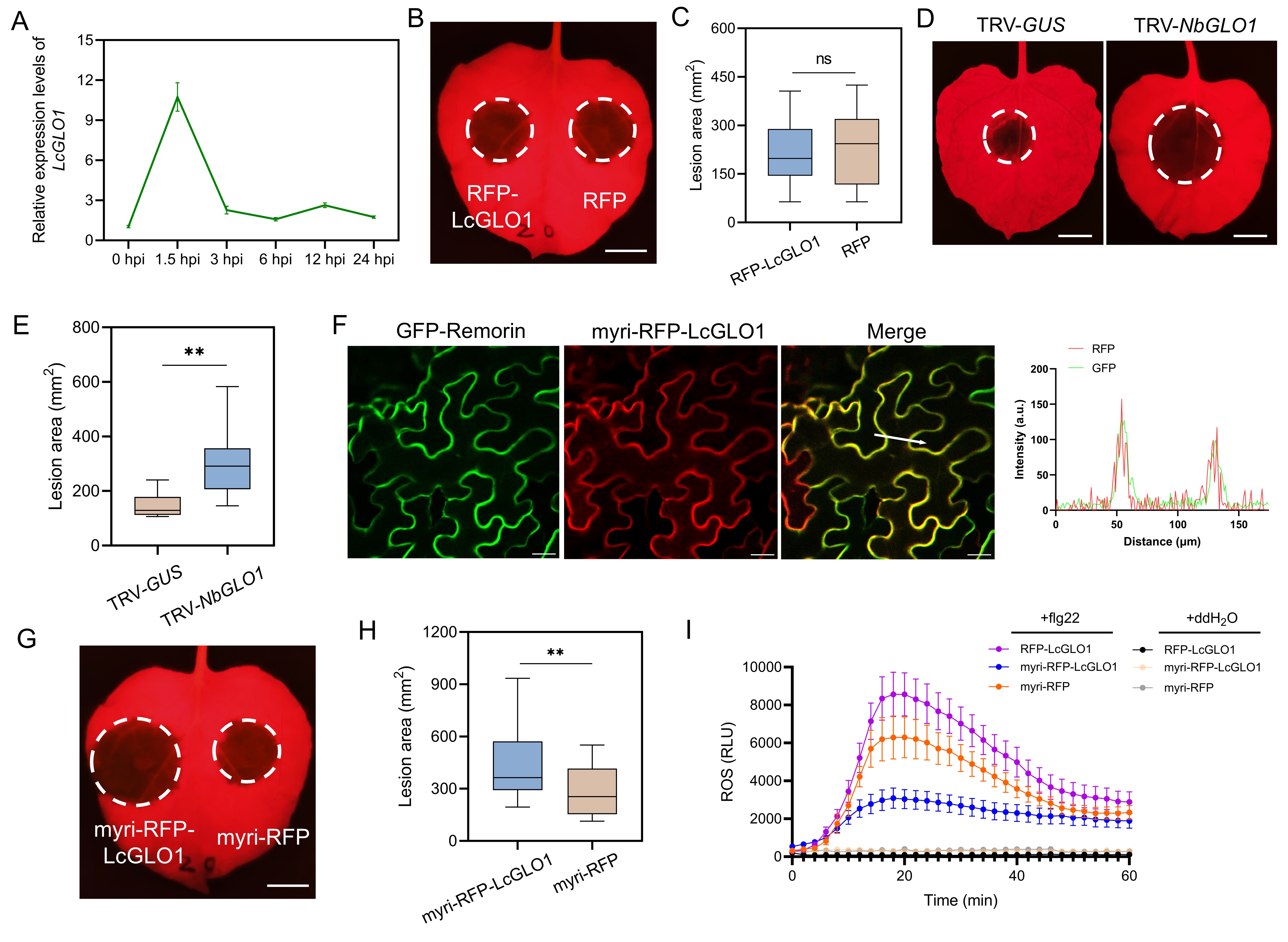 该研究还发现质膜定位的LcGLO1能够与LcCPK5互作,该蛋白是一个能磷酸化RBOHD的钙依赖性蛋白激酶,能将病原菌侵染胁迫诱发的瞬时钙信号迅速转化为磷酸化事件,进而调控ROS迸发;两蛋白互作后可以抑制LcRBOHD的蛋白积累量,降低ROS迸发。