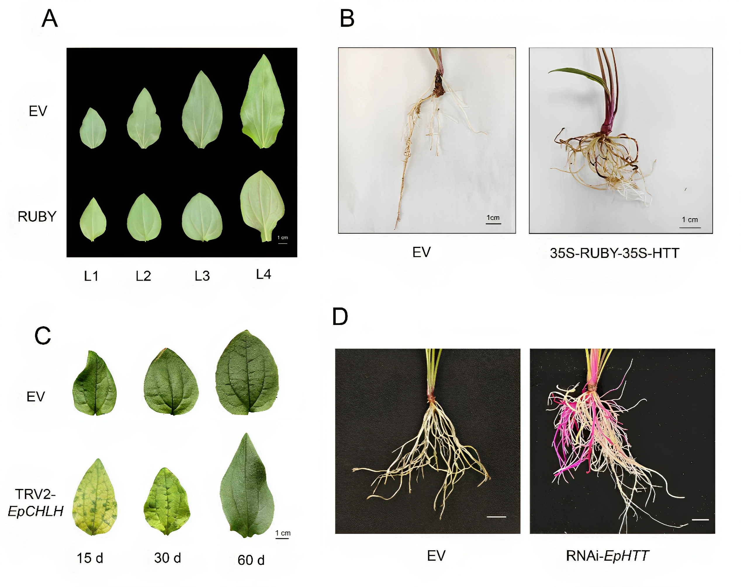研究团队通过参数优化,建立了农杆菌介导的叶片瞬时表达体系,确定了适宜菌株与叶龄组合,实现了外源基因的高效表达;并在cut-dip-budding(CDB)系统基础上进行了改良,构建了发根农杆菌介导的稳定表达体系。利用该体系验证了菊苣酸合成关键基因EpHTT的功能,揭示了其在菊苣酸生物合成中的正向调控作用。同时,团队建立了原生质体瞬时表达体系与基于烟草脆裂病毒(TRV)的基因沉默体系,优化了相关参数条件,并筛选出EpCHLH作为理想的沉默指示基因。通过沉默菊苣酸合成通路关键基因 (EpHCT、EpHTT、EpCAS),验证了该体系在功能基因研究中的可行性与稳定性。