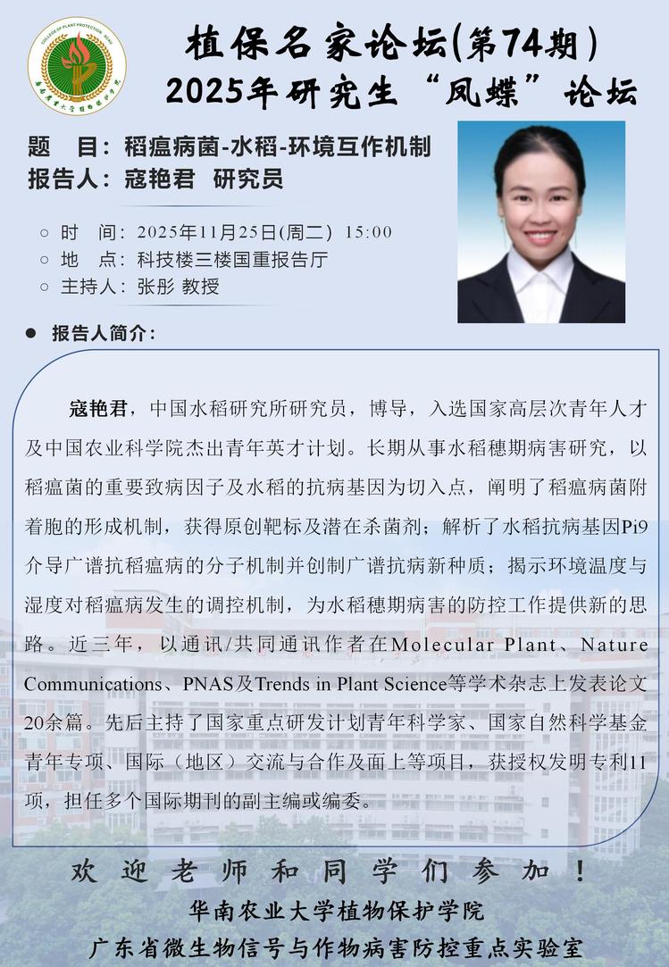 植保名家论坛(第74期):玉米镰孢菌穗腐病致害规律与绿色防控技术探索、稻曲病菌劫持水稻脂质信号操控小花发育和免疫的机制、稻瘟病菌-水稻-环境互作机制