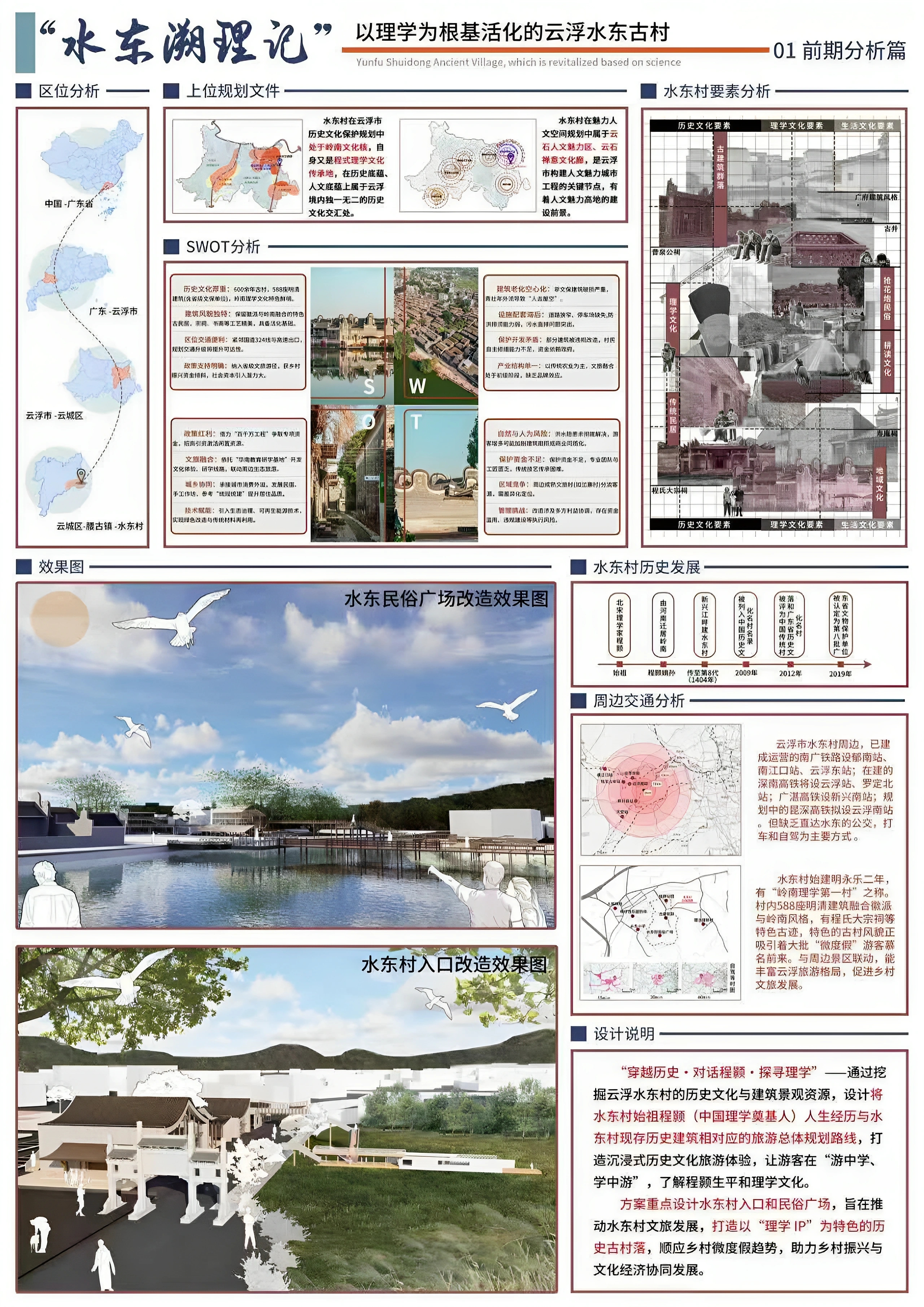 《水东溯理记》由华南农业大学水利与土木工程学院建筑系2021级本科生创作。作品通过挖掘广东省云浮市水东古村的历史文化与建筑景观资源,设计将水东村始祖程颢(中国理学奠基人)人生经历与水东村现存历史建筑相对应的旅游总体规划路线,打造沉浸式历史文化旅游体验,让游客在“游中学、学中游”,了解程颢生平和理学文化。方案重点设计水东村入口和民俗广场,旨在推动水东村文旅发展,打造以“理学IP”为特色的历史古村落,顺应乡村微度假的趋势,助力乡村振兴与文化经济协同发展。