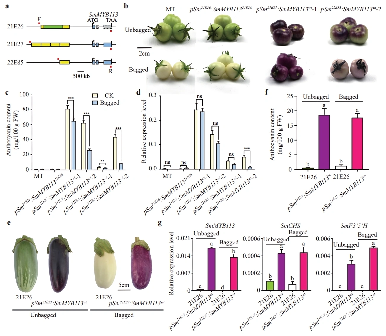 研究团队通过QTL-seq定位、基因定位与遗传互补验证等系列实验,将控制茄子非光敏型果色位点SmNPS10.1定位于10号染色体约33.58 kb范围内,该区间内仅含有一个基因:SmMYB113,编码R2R3-MYB转录因子。序列分析发现,非光敏型茄子品种21E27的SmMYB113启动子区域存在独特的725bp串联重复序列,且以4个拷贝形式存在,而光敏型品种仅含1个拷贝。这一重复序列的拷贝数增加,能够驱动SmMYB113基因不依赖光照持续表达,进而促进花青素稳定积累。转基因遗传互补实验进一步验证了该机制:将含4个重复拷贝的SmMYB113基因导入光敏性茄子和番茄后,转基因植株果实均获得了不依赖于光照的花青素合成能力。同时,团队开发的KASP分子标记21QP381(关联花青素存在)和23QP715(关联非光敏型性状),在264份自然栽培品种中验证准确率分别达97.3%和95.8%,为快速筛选目标性状提供了高效工具。