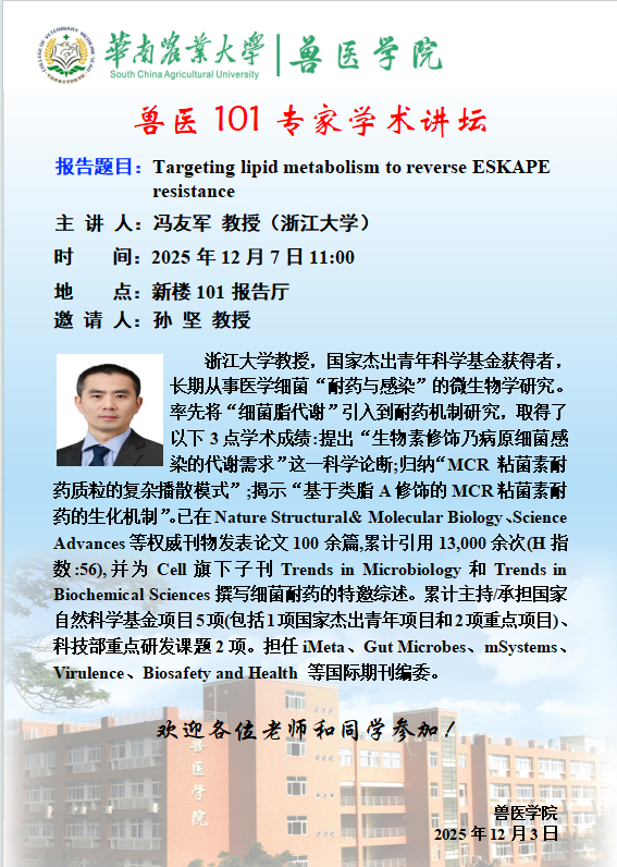 兽医101著名专家学术讲坛:Targeting lipid metabolism to reverse ESKAPE resistance