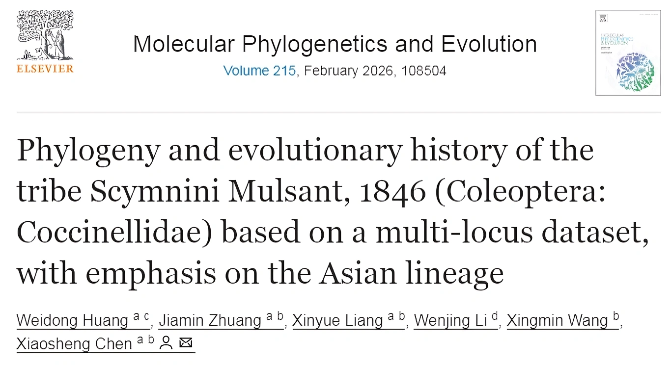 近日,林学与风景园林学院陈晓胜副教授与生物防治教育部工程研究中心王兴民教授团队在国际系统与进化生物学领域知名期刊Molecular Phylogenetics and Evolution(中科院一区,TOP期刊)上发表了题为“Phylogeny and evolutionary history of the tribe Scymnini Mulsant, 1846 (Coleoptera: Coccinellidae) based on a multi-locus dataset, with emphasis on the Asian lineage”的研究论文。该研究基于多位点分子标记,解析了亚洲小毛瓢虫族的系统发育关系与演化历史,为修订其分类体系提供了新的系统发育框架,对其演化历史提供了新的见解。
