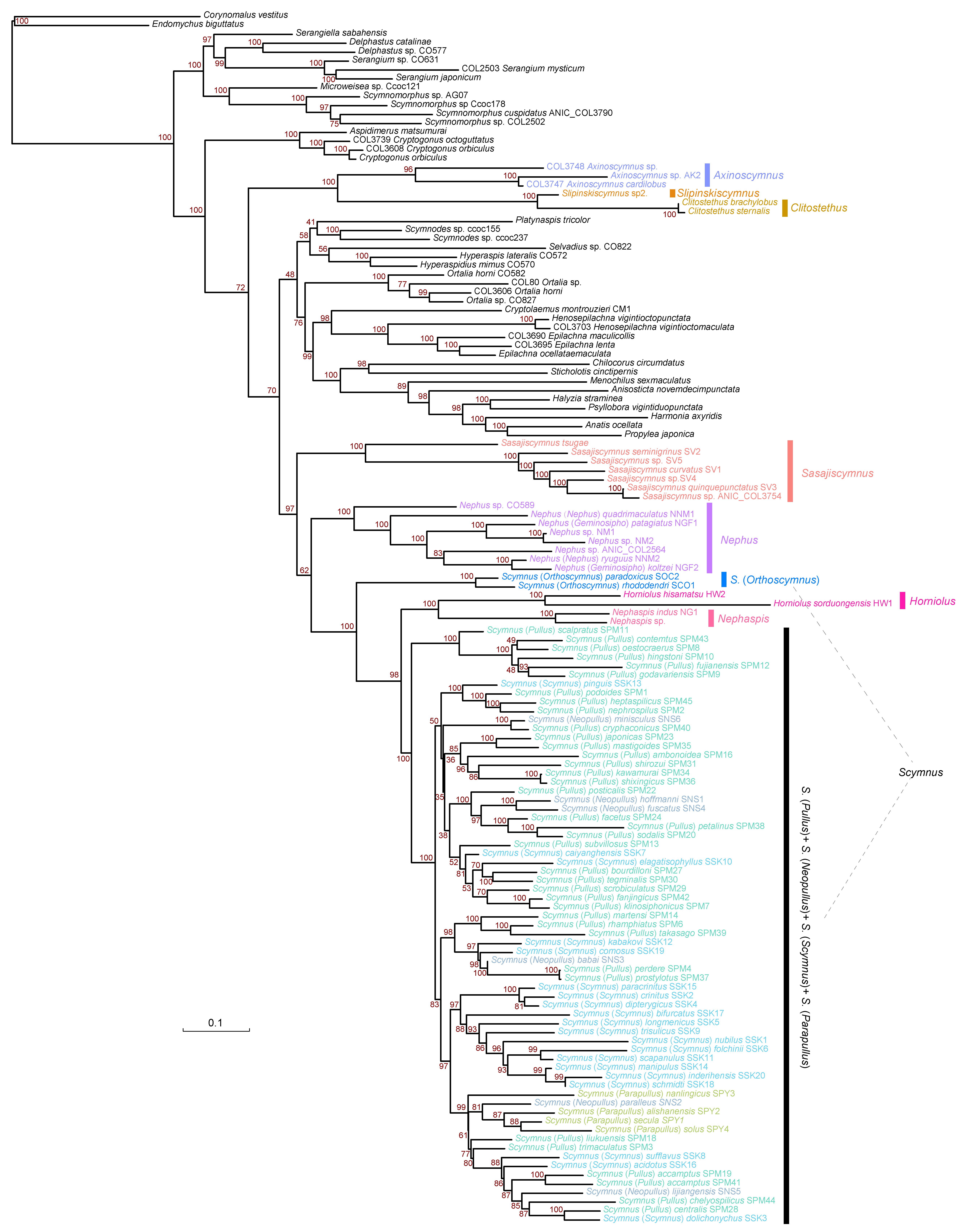 本研究基于3个线粒体和5个核基因分子标记(总长4,935 bp),对亚洲小毛瓢虫族的系统发育关系与演化历史进行了研究。研究结果证实了亚洲小毛瓢虫族的非单系性,其中斧瓢虫属Axinoscymnus、陡胸瓢虫属Clitostethus和奇叶毛瓢虫属Slipinskiscymnus形成一个独立的分支,与小毛瓢虫族的主要类群相分离。研究结果高度支持了弯叶毛瓢虫属Nephus、方突毛瓢虫属Sasajiscymnus、云瓢虫属Nephaspis和角毛瓢虫属Horniolus的单系性。同时,小毛瓢虫属Scymnus的单系性未得到证实,原因在于两个直小毛瓢虫亚属Scymnus(Orthoscymnus)的样品聚为一支,并与小毛瓢虫属的其他类群分离;小毛瓢虫属内部亚属之间的系统发育关系较为混乱,需进行进一步的分类学修订。分歧时间的估算结果显示,亚洲小毛瓢虫族的物种多样化发生在古新世至中新世之间,同时瓢虫的起源时间可追溯至白垩纪早期的1.43亿年前(143 Mya)。总体而言,该研究是目前针对小毛瓢虫族取样最为广泛的系统发育研究工作,其结果对于小毛瓢虫族的分类修订以及对其演化历史的理解具有重要意义,同时也将推动亚洲乃至世界范围内瓢虫系统分类学工作的发展。