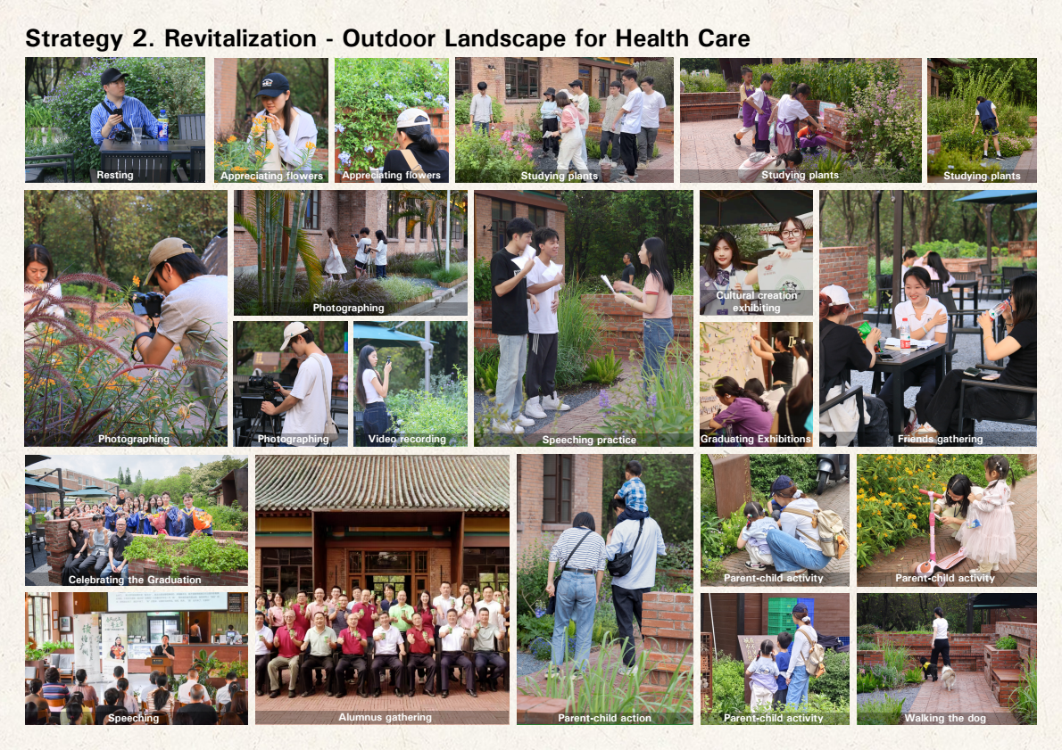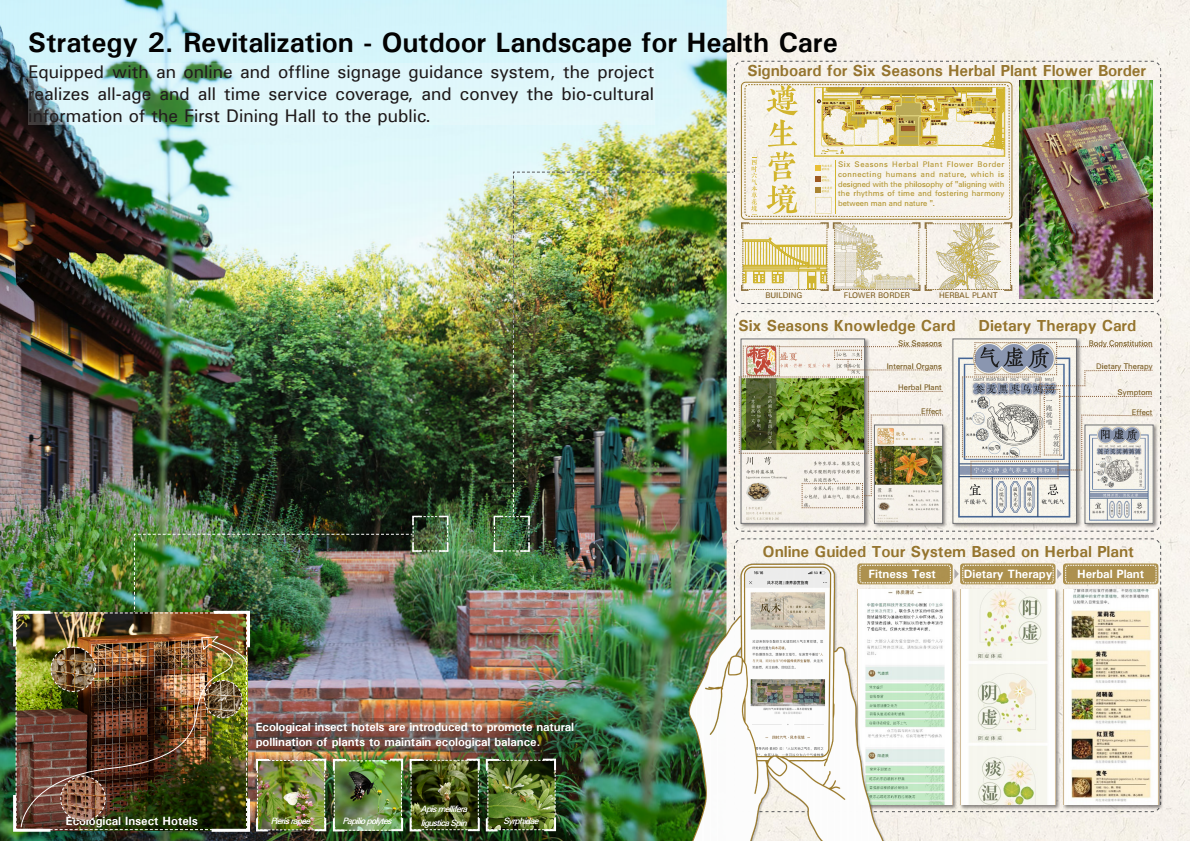 项目呼应校园文化建设,在户外园林中设置了航天育种水稻栽植展示点与华农酸奶瓶历史记忆景墙等校园文化要素。此外,花境中还设置了科普标识系统,系统展示了四时六气本草花境、城市自然以及校园文化等多方面的科普标识内容。户外环境再生设计统筹考虑了校园自然环境与校园历史文化,并将其统一为一个整体,引导校园师生重拾中国传统养生智慧,回归人与天调、顺时合序的传统天人关系。